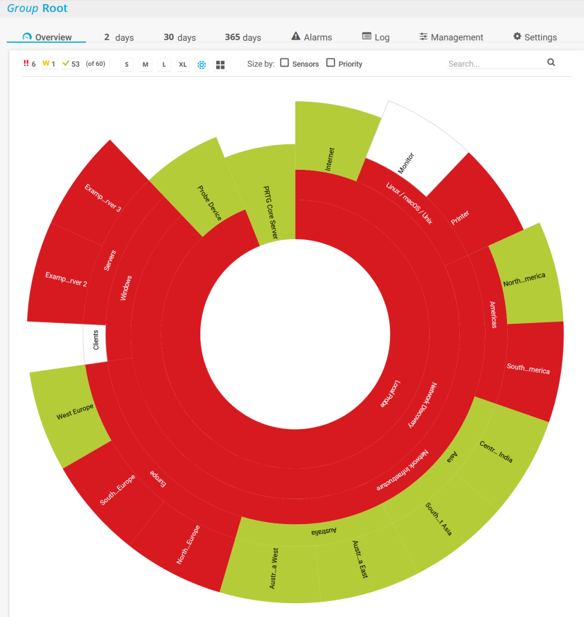 There are two additional options to the classic device tree view with which you can display the status of all sensors of your entire installation in a single overview. Click b_view_sunburst to change to the sunburst view. To change to the tree map view, click b_view_tree_map.