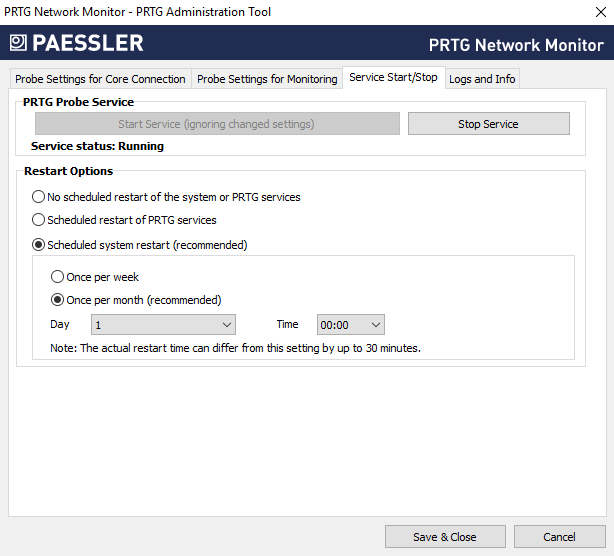 • No scheduled system or service restart: Do not automatically perform a scheduled restart of services. We recommend that you manually restart the PRTG core server system every few weeks. You can initiate a restart of the PRTG probe service in the Administrative Tools in the PRTG web interface.